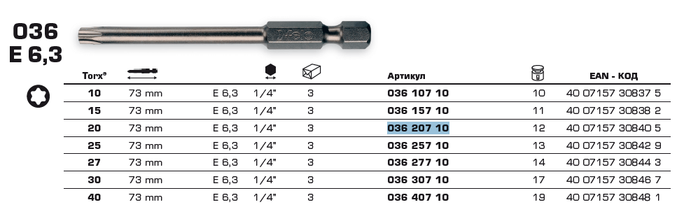 036 207 10 Бита Torx 20x73 серия Industrial, 3 предмета FELO