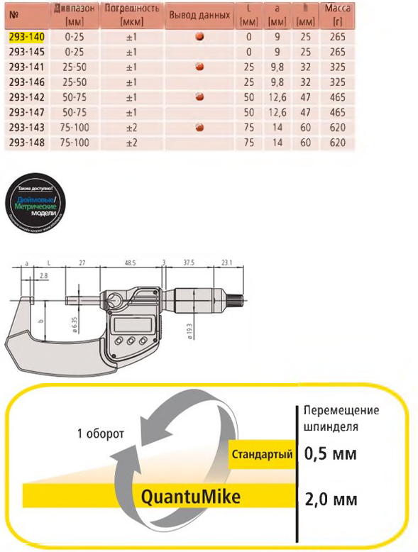 - Высочайшая точность, инструментальная погрешность составляет всего ±1 мкм (для моделей с диапазоном до 75 мм).