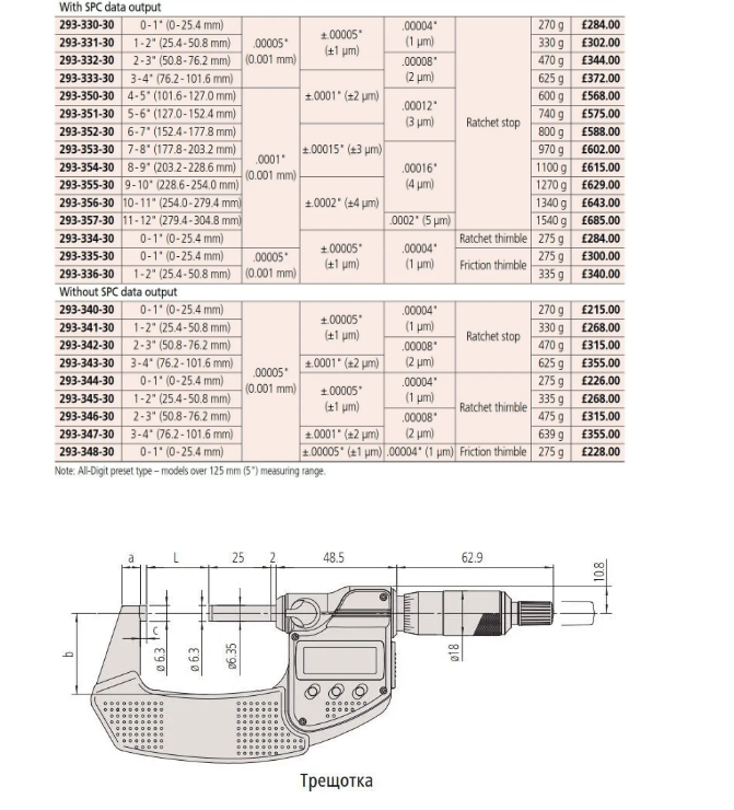 Технические характеристики микрометра MITUTOYO 293-341-30