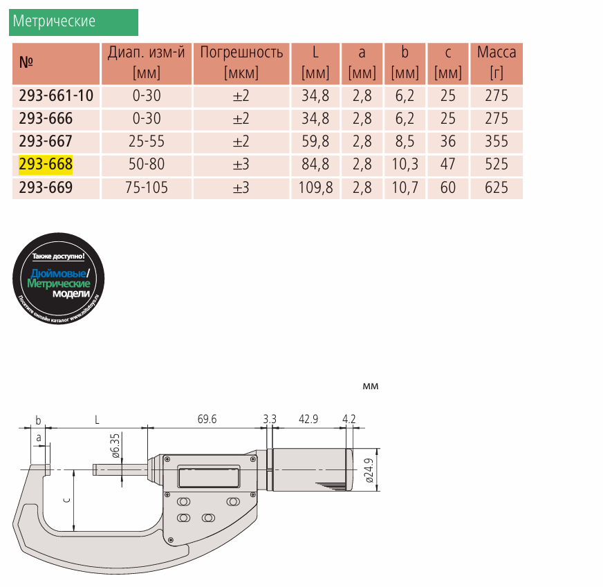 293-668-20 Микрометр MITUTOYO 50-80 мм 0,001 мм QuiсkМikе