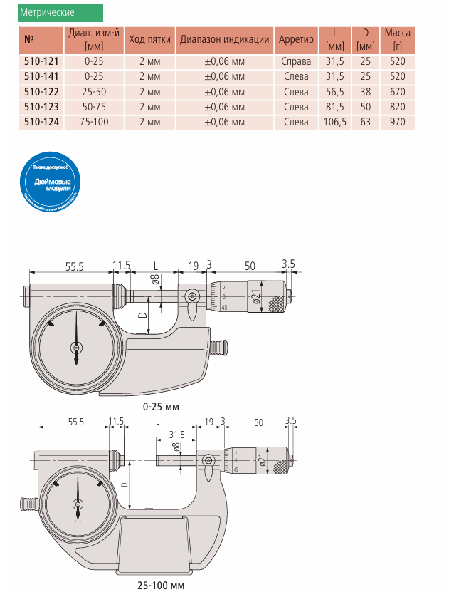 Микрометр MITUTOYO 0-25 мм рычажный 510-121 представляет собой высокоточный прибор, позволяющий измерять абсолютные и относительные линейные размеры деталей в сфере приборо- и машиностроения.