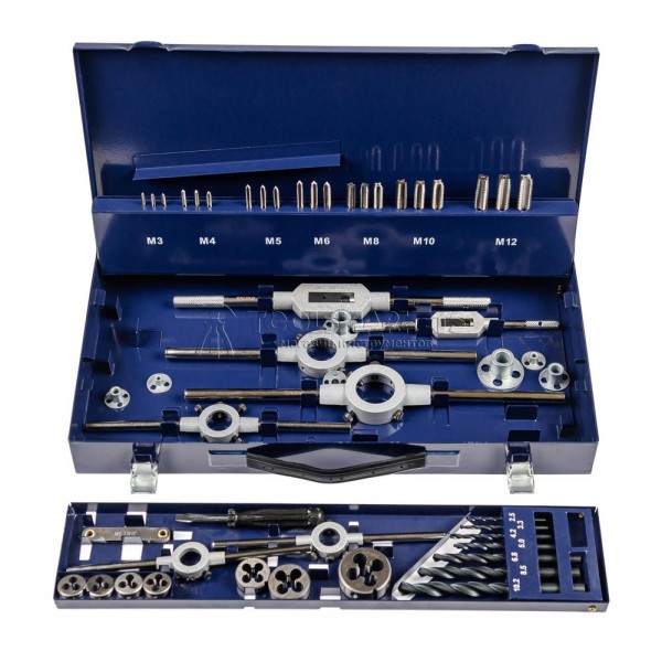 ZA-10721 Набор резьбонарезного инструмента ZALTAR, 15SF HSS, 51 пр., M3-M4-M5-M6-M8-M10-M12 Содержит оснастку самых востребованных типов и размеров для нарезания метрической резьбы с углом профиля 60°. Рекомендовано для обработки стали до 800 Н/мм2, алюминия, латуни, пластика. Допустимо для обработки бронзы, чугуна. Инструменты надежно закреплены в прочном металлическом чемодане, пригодном для хранения и транспортировки. Комплектация (51 предмет): Наборы ручных метчиков (черновой, средний, чистовой) DIN 352: M3 / M4 / M5 / M6 / M8 / M10 / M12 Плашки круглые DIN EN 22568, DIN 223 B, допуск 6g: M3 / M4 / M5 / M6 / M8 / M10 / M12 Метчикодержатели регулируемые DIN 1814: Gr. 1 / Gr. 2 Плашкодержатели DIN 225: 20x5 / 20x7 / 25x9 / 30x11 / 38x14 мм Спиральные свёрла DIN 338: Ø 2.5 / 3.3 / 4.2 / 5.0 / 6.8 / 8.5 / 10.2 мм Направляющие: Nr. 1 / 2 / 3 / 4 / 5 / 6 / 7 Отвёртка + резьбомер