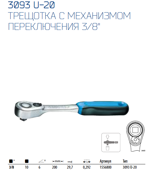 3093 U-20 ТРЕЩОТКА С МЕХАНИЗМОМ ПЕРЕКЛЮЧЕНИЯ 3/8"